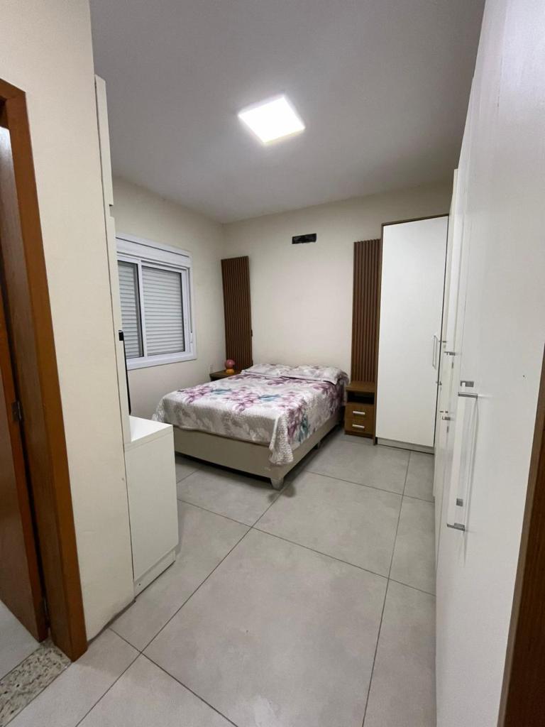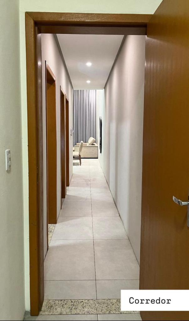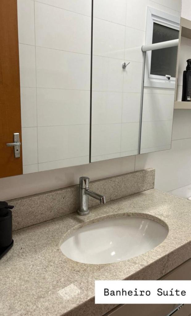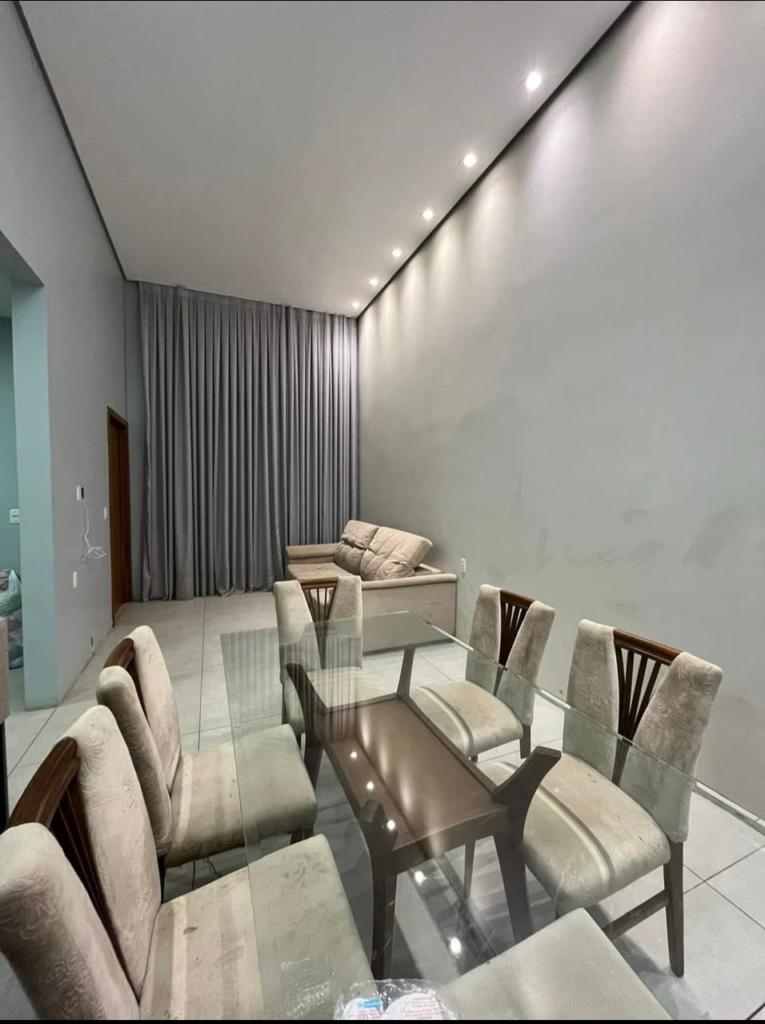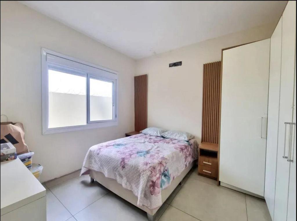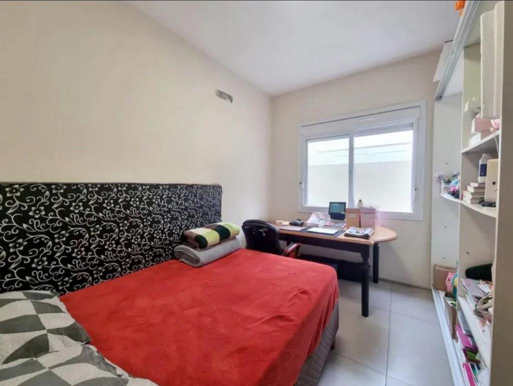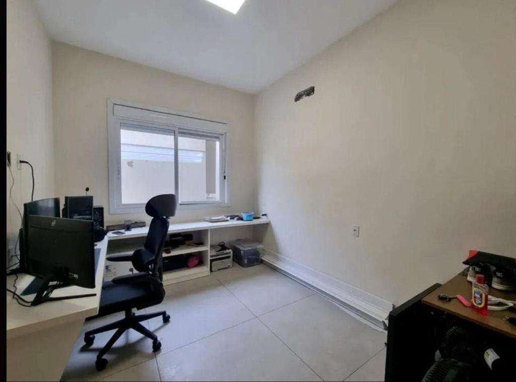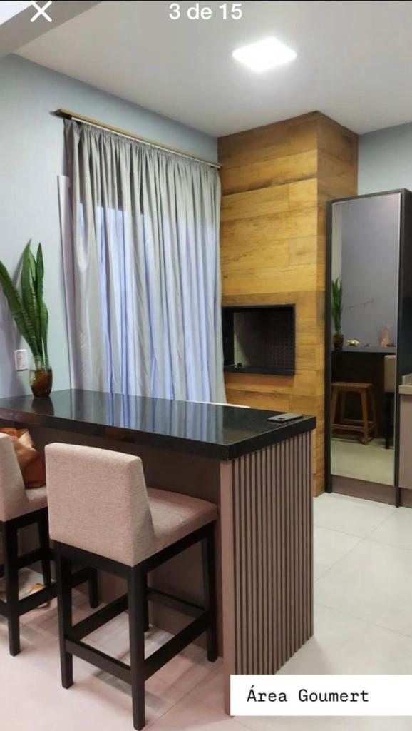 O imóvel possui três quartos, sendo uma suíte, sala, cozinha, área gourmet, churrasqueira, jardim e vaga de garagem.