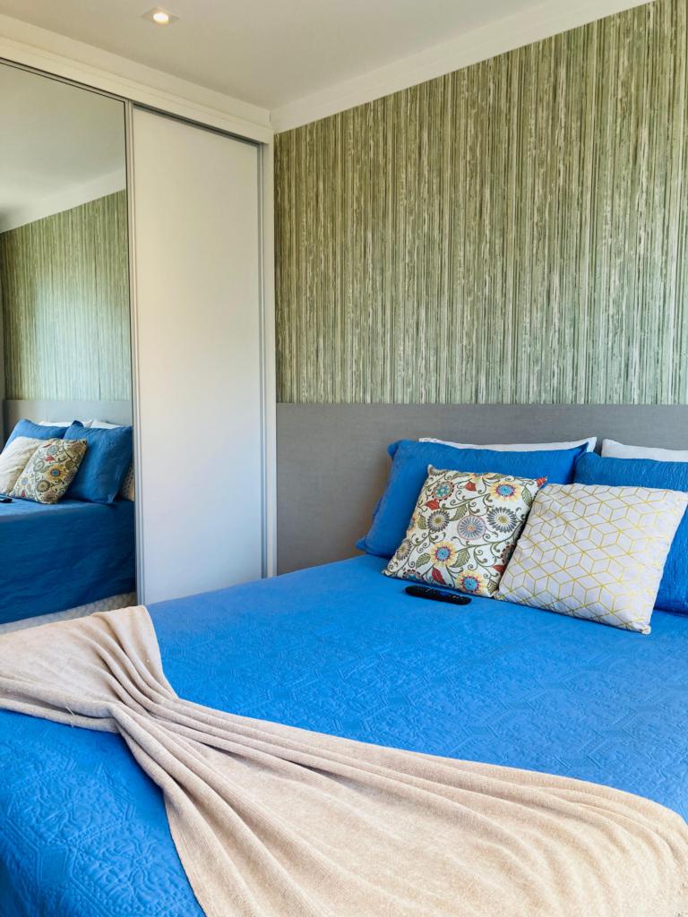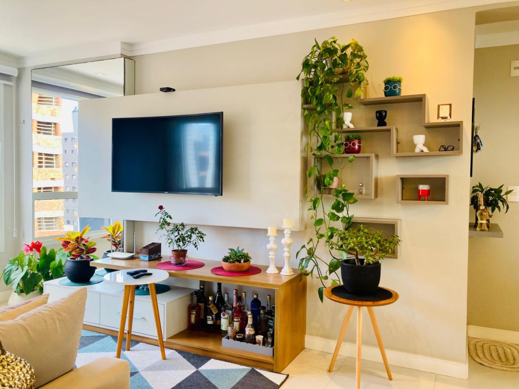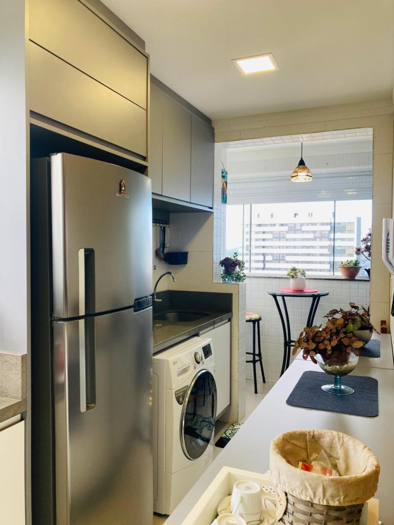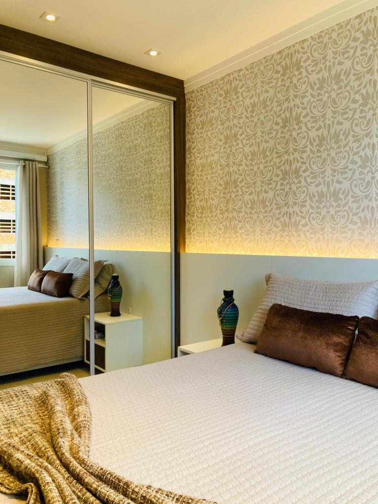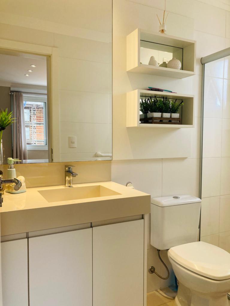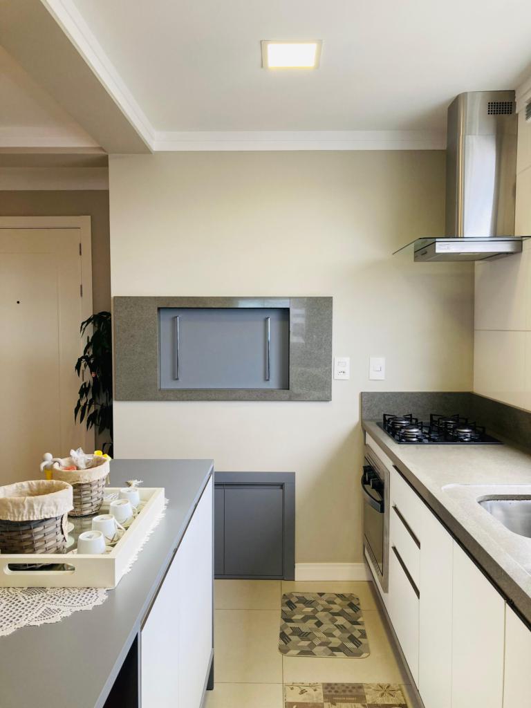 Excelente apartamento mobiliado com dois dormitórios, sendo uma suíte, lavabo, banheiro social, amplo living integrado com sala de estar/jantar/cozinha, área de serviço, churrasqueira e duas vaga na garagem.