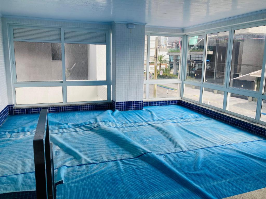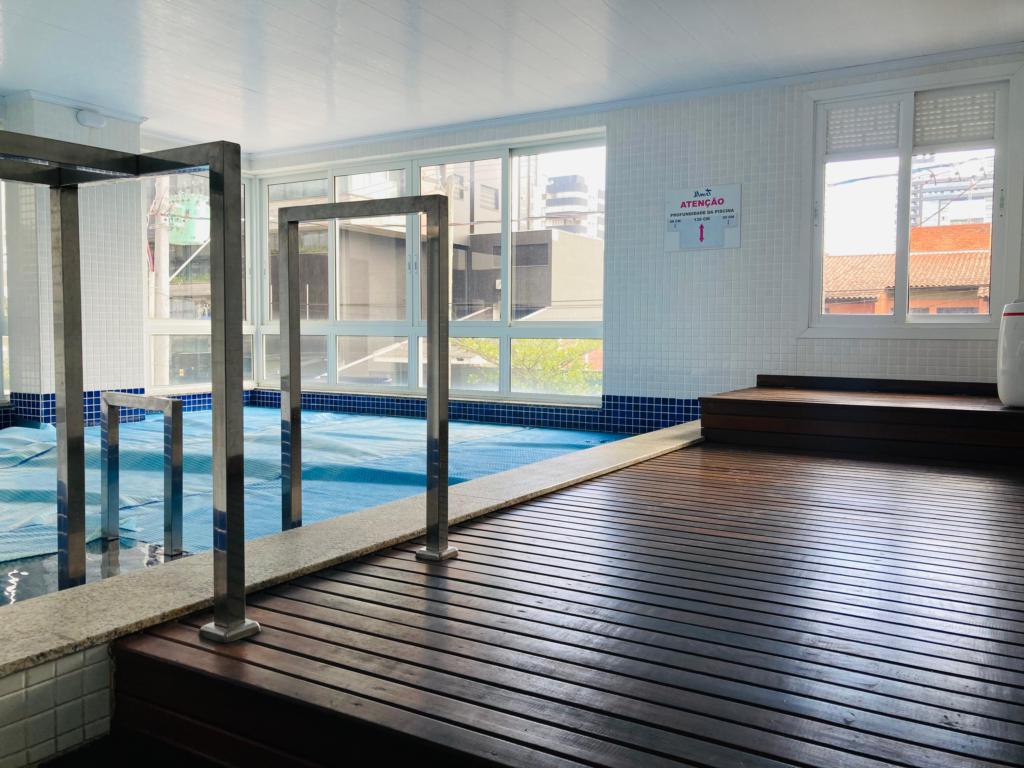 O condomínio conta com um salão de festas e elevador e piscina térmica.