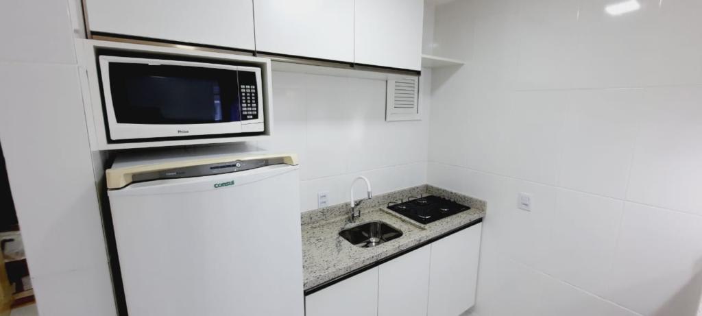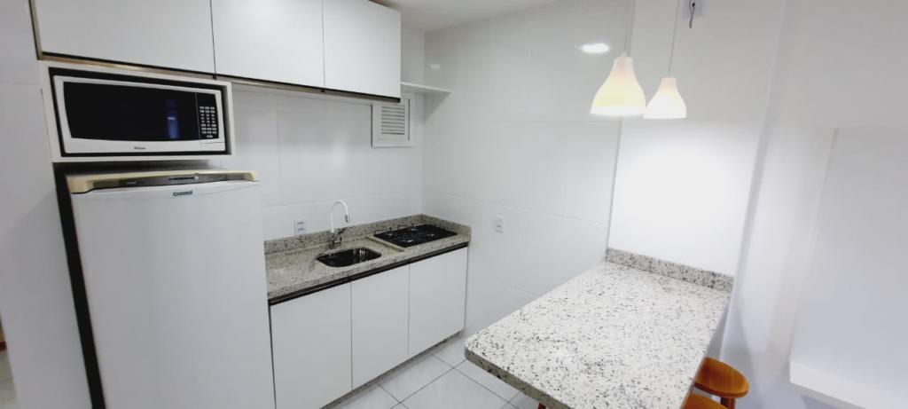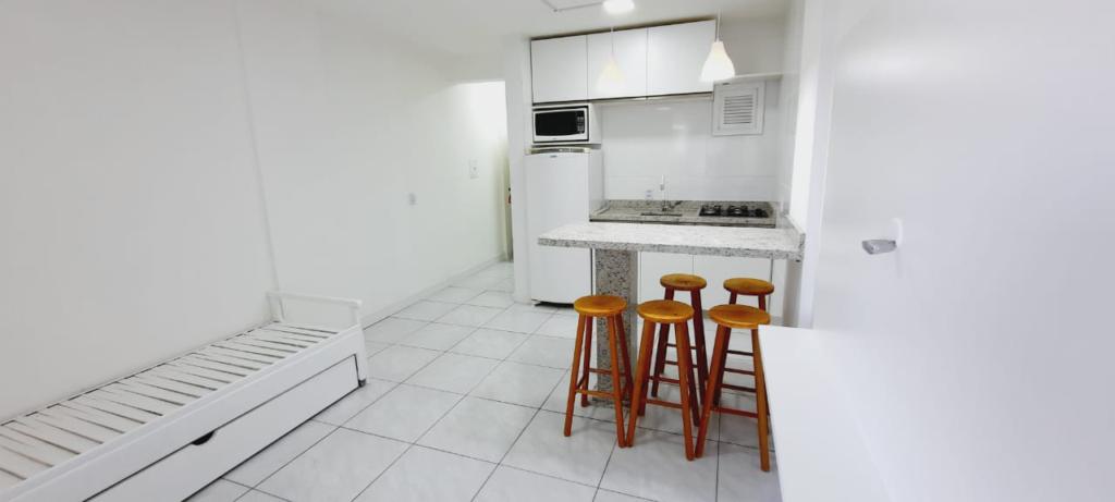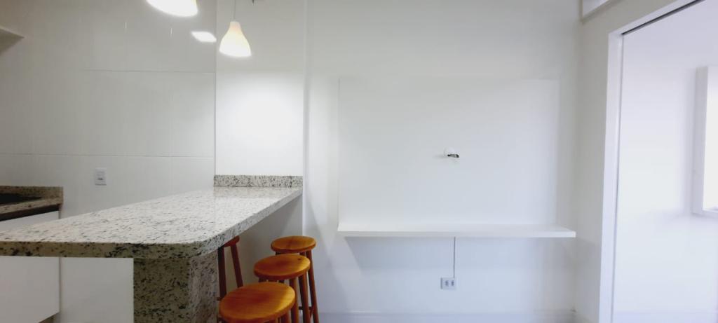 O imóvel esta mobiliado, com ar condicionado, cozinha com micro-ondas, geladeira, cooktop, cama, sofá cama, painel de Tv na sala, bancada com bancos, banheiro com balcão, lâmpadas em led.