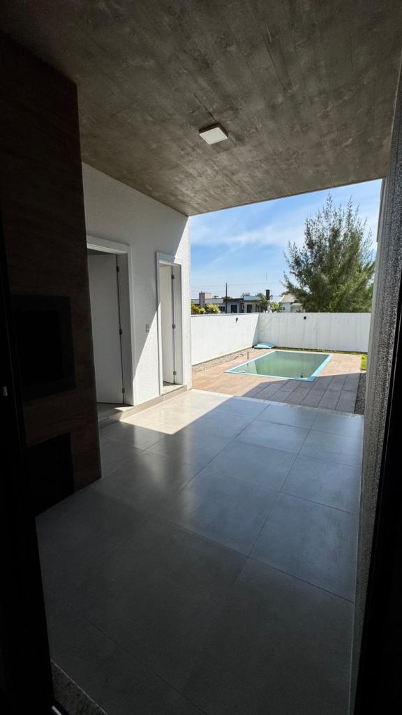 Linda casa de três dormitórios, sendo uma suíte, sala de estar e jantar integradas, lavanderia, piscina, área gourmet com churrasqueira e garagem para três carros.