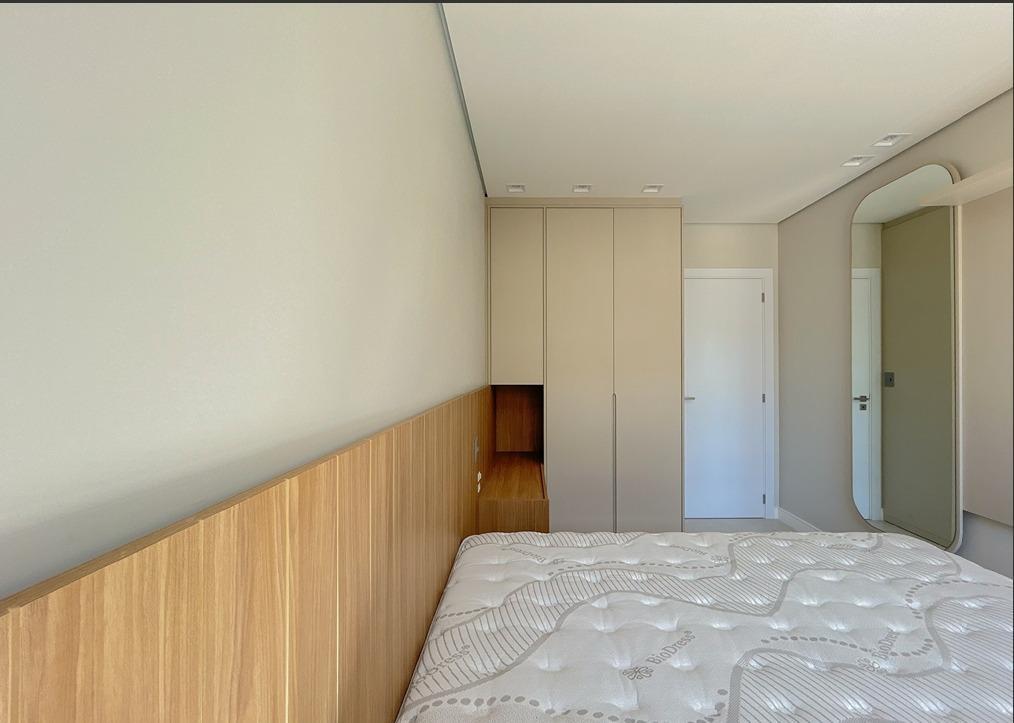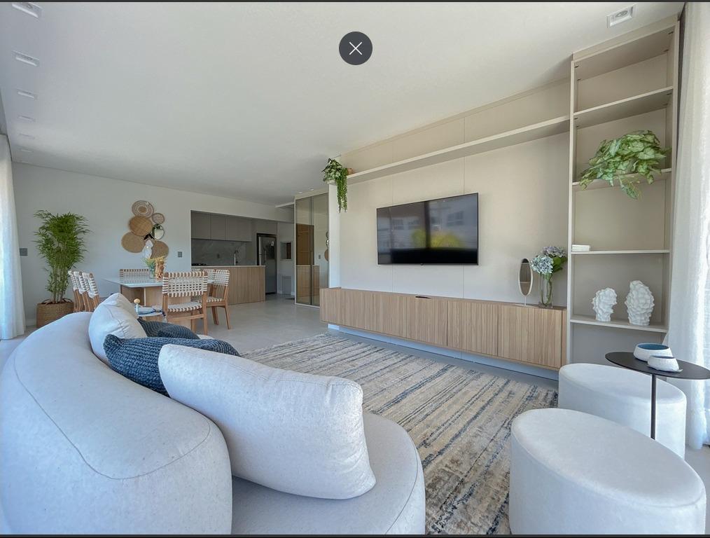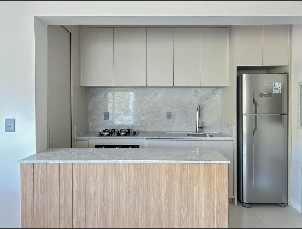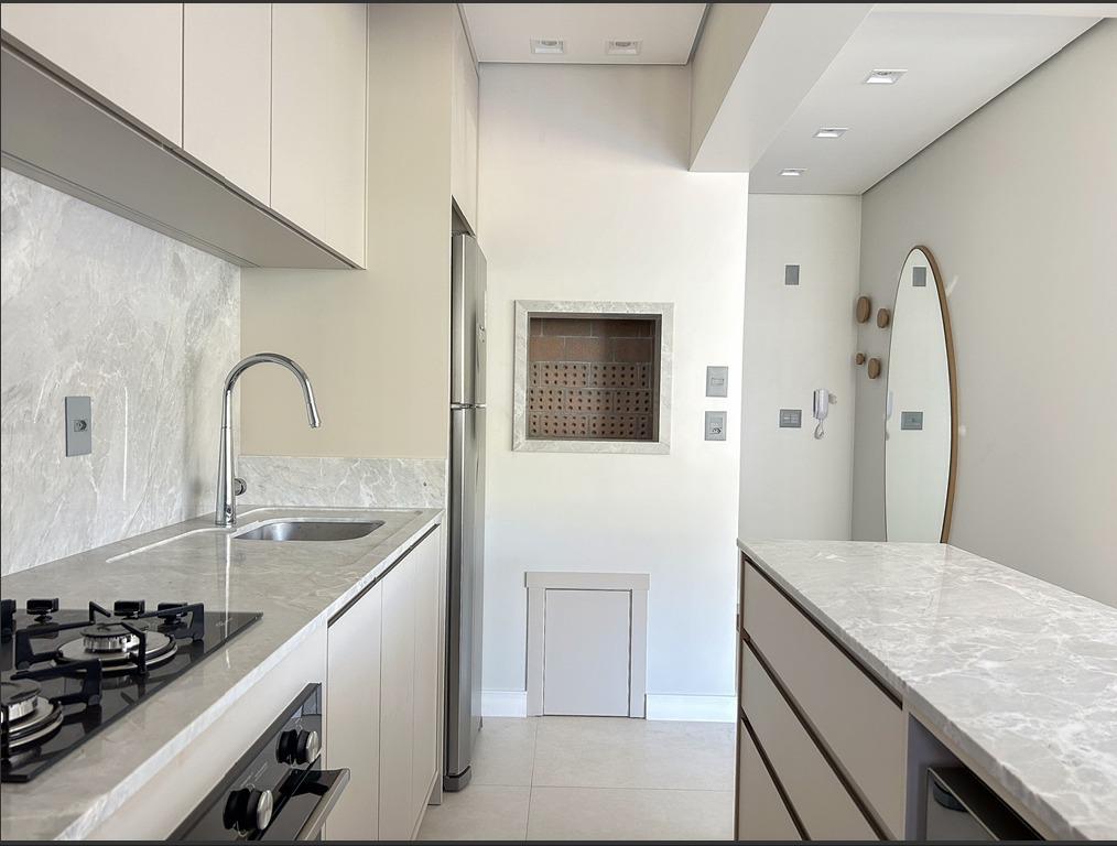 Apartamento de três dormitórios sendo uma suíte, ampla cozinha, sala de estar e jantar integrados, área de serviço, churrasqueira e uma vaga de garagem, apartamento mobiliado.