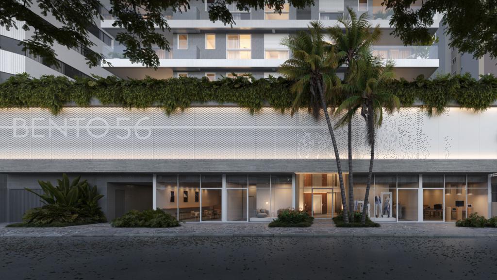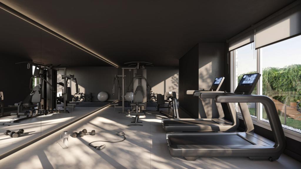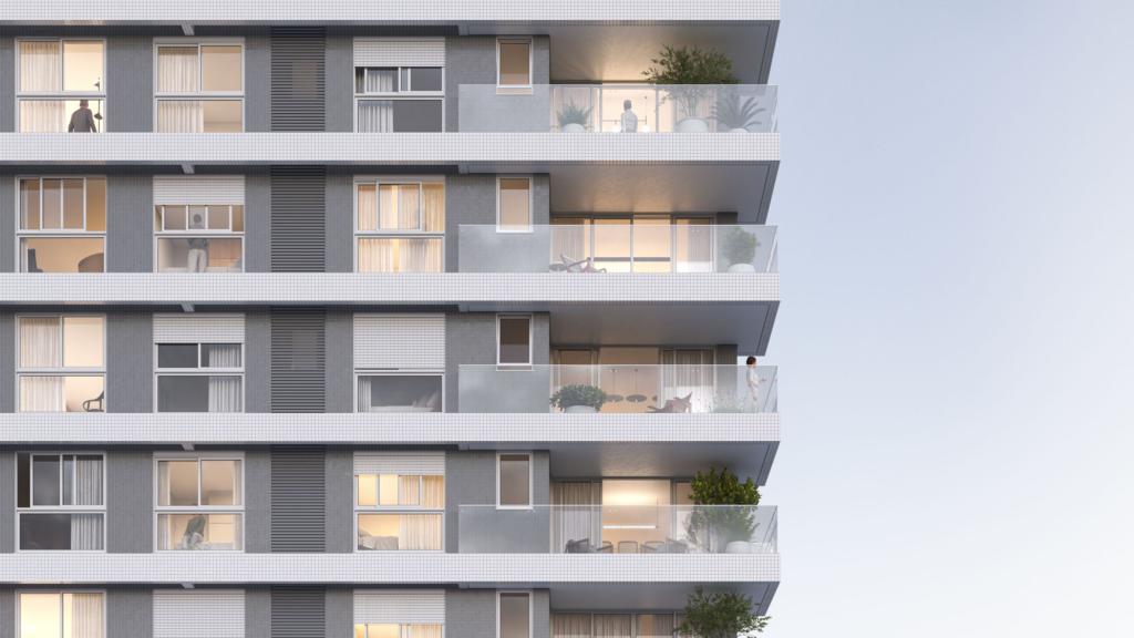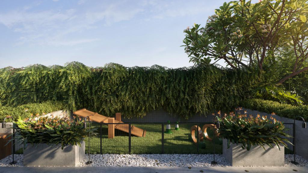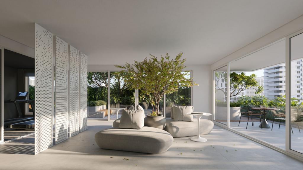 sala de estar e jantar integradas, área de serviço, churrasqueira, um lavabo e uma vaga de garagem.