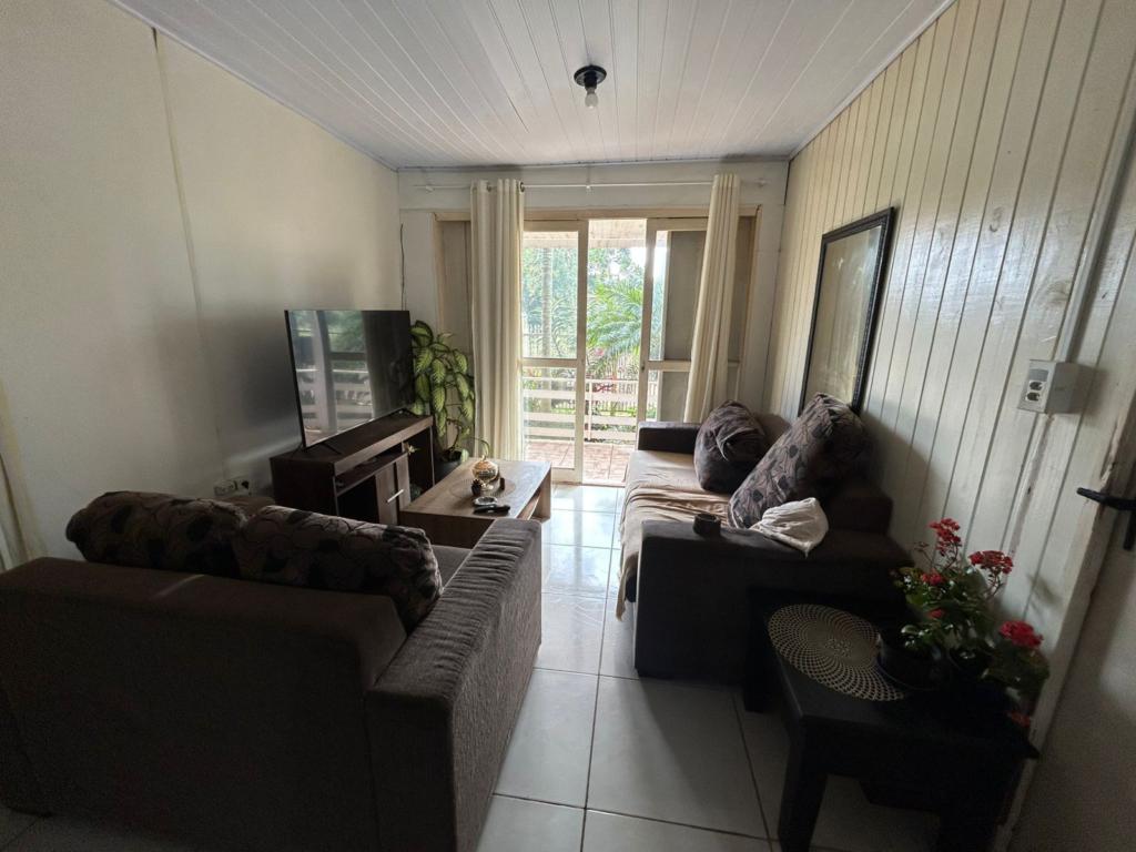 A casa de madeira conta com três dormitórios, sala e cozinha integrados, um banheiro e duas vagas de garagem.