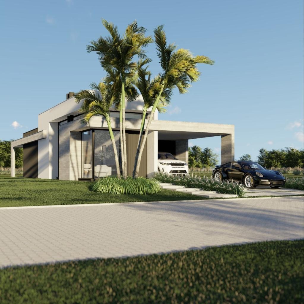 O imóvel apresenta acabamento de alto padrão e uma planta inteligente, com construção térrea contemporânea e volumetria imponente.